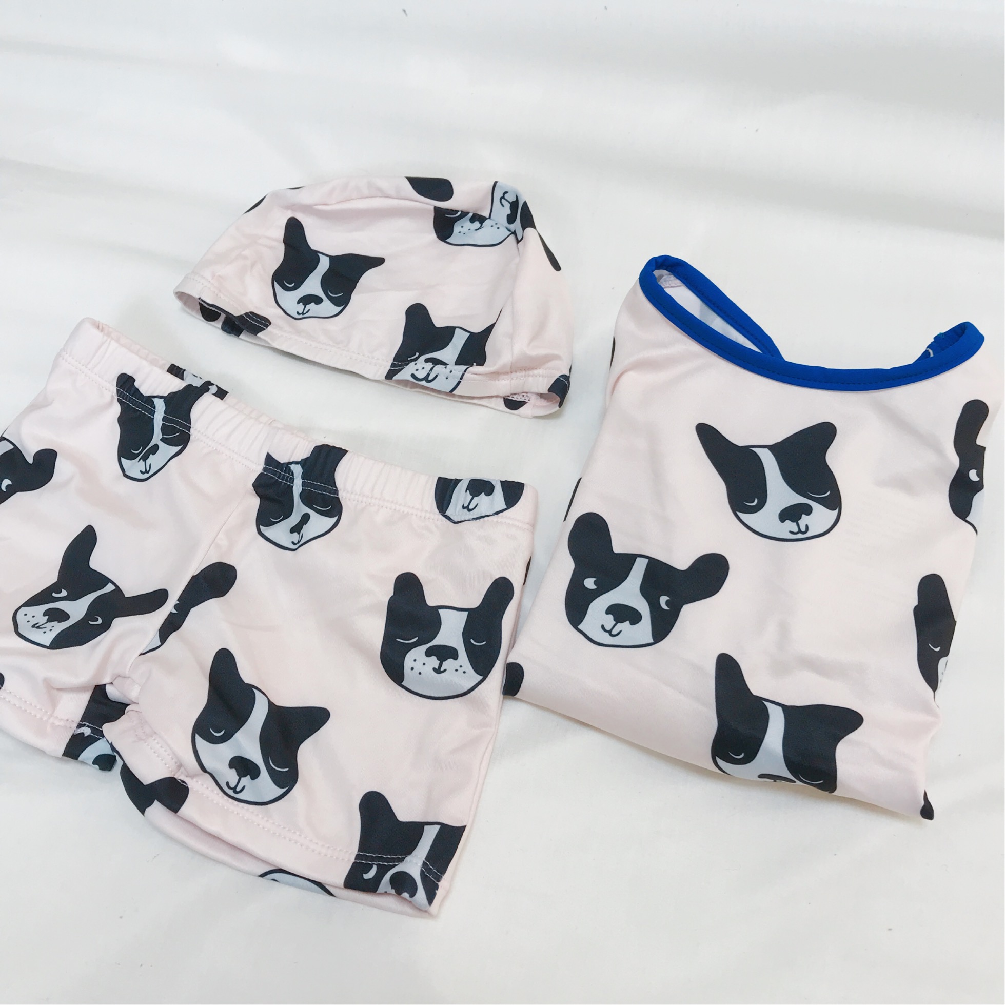フレンチブルドッグ柄 スイムウェア 入荷しました。フレンチブルドッグ柄の水着です。セット内容はラッシュガード、スイムショーツ、スイムキャップの3点です。薄いピンクの生地にフレンチブルドッグの総柄がとて...
