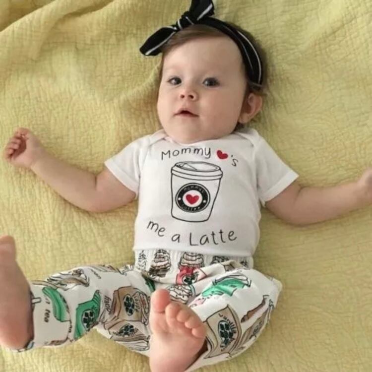 フラペチーノ柄 ロンパース、パンツ、リボンのセットアップ 3点です。
